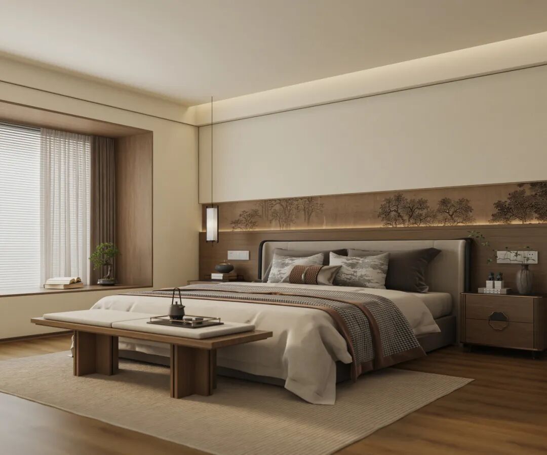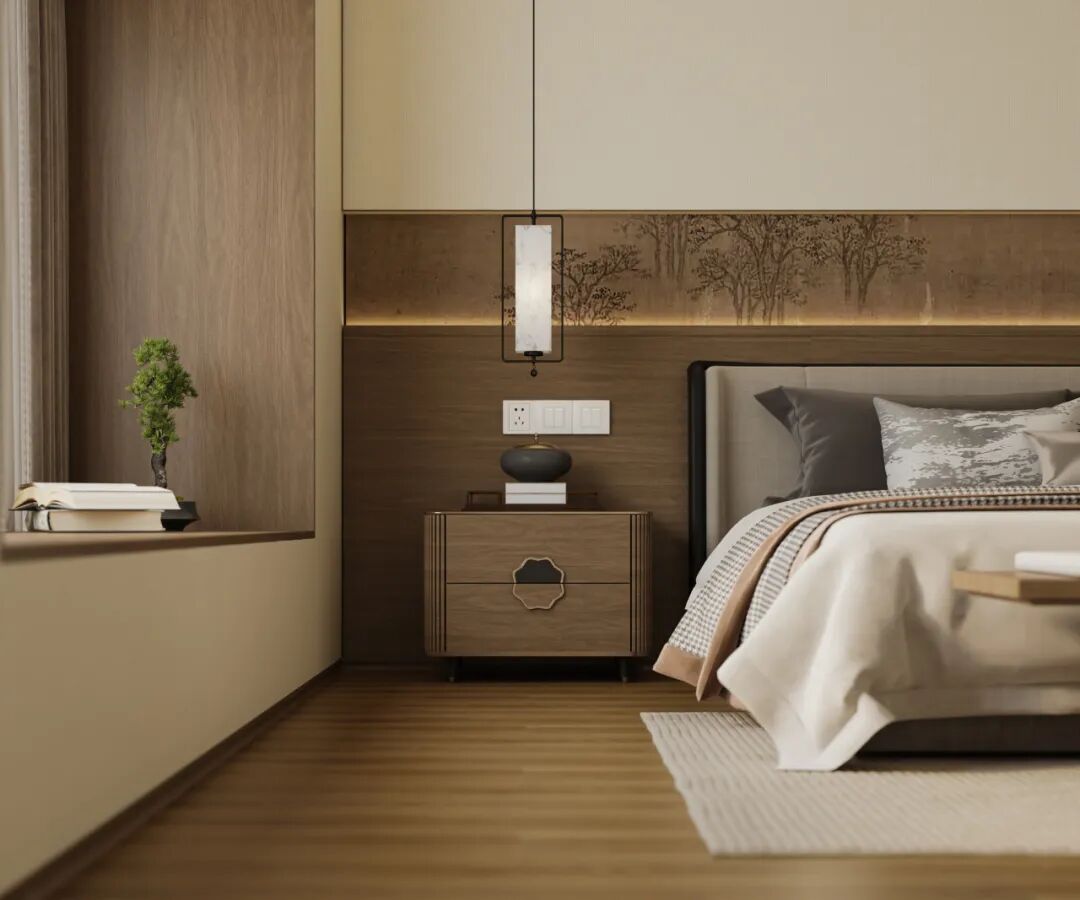 臥室以舒適好睡為核心,地面鋪溫潤石晶木地板·印橡-經典咖,墻面用綠色科技板·麻布素紋做背景墻,淺色調溫柔如月光。定制墻板:水墨樹影紋樣,非常有中式意境。且比墻布易清潔,環保基材,保障睡眠安心。