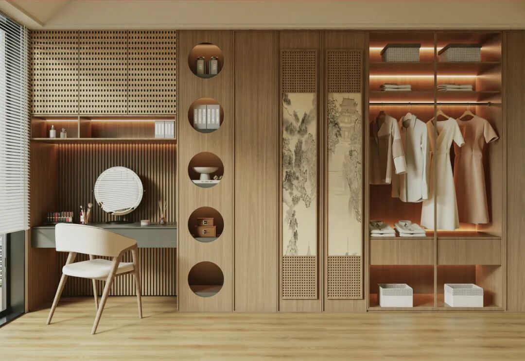 衣帽間以美觀實用為主,地面鋪設石晶地板系列「印·橡-經典咖」,溫潤的木紋肌理自帶古樸質感,與新中式風格相得益彰。石晶地板防水耐磨、打理便捷,適配衣帽間收納場景,讓空間更有禪意氛圍。