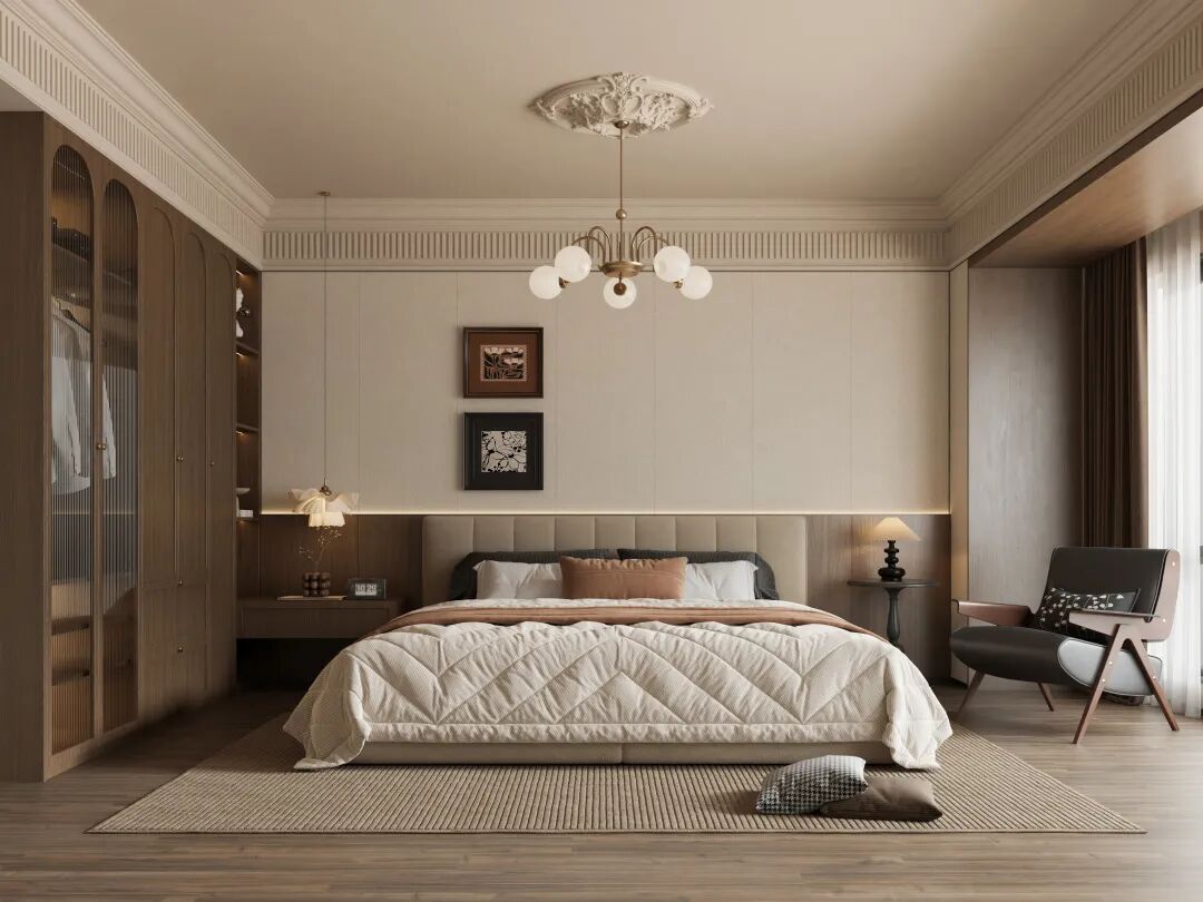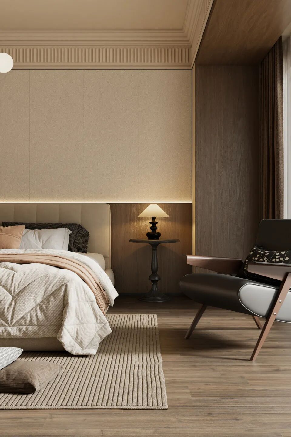 臥室主打溫潤松弛,暖杏色墻面搭配法式拱形床頭,簡約復古。淺軟床品配復古臺燈,暖光治愈,隔絕喧囂。