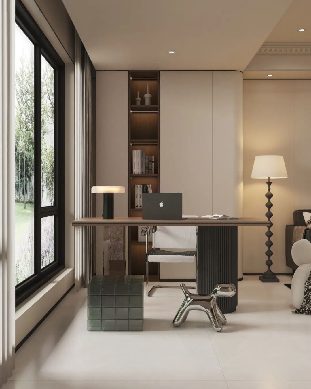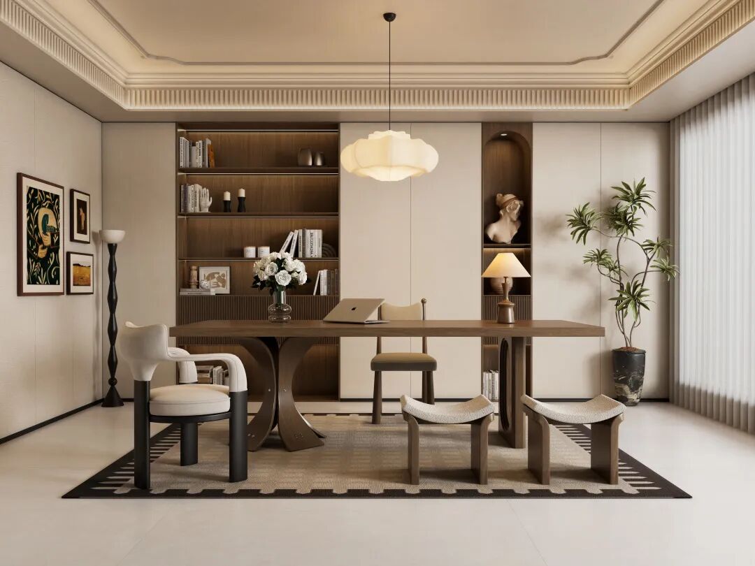 書房延續整體復古格調,淺木色書桌搭配皮質座椅,墻面點綴復古裝飾畫,營造靜謐專注的閱讀氛圍。