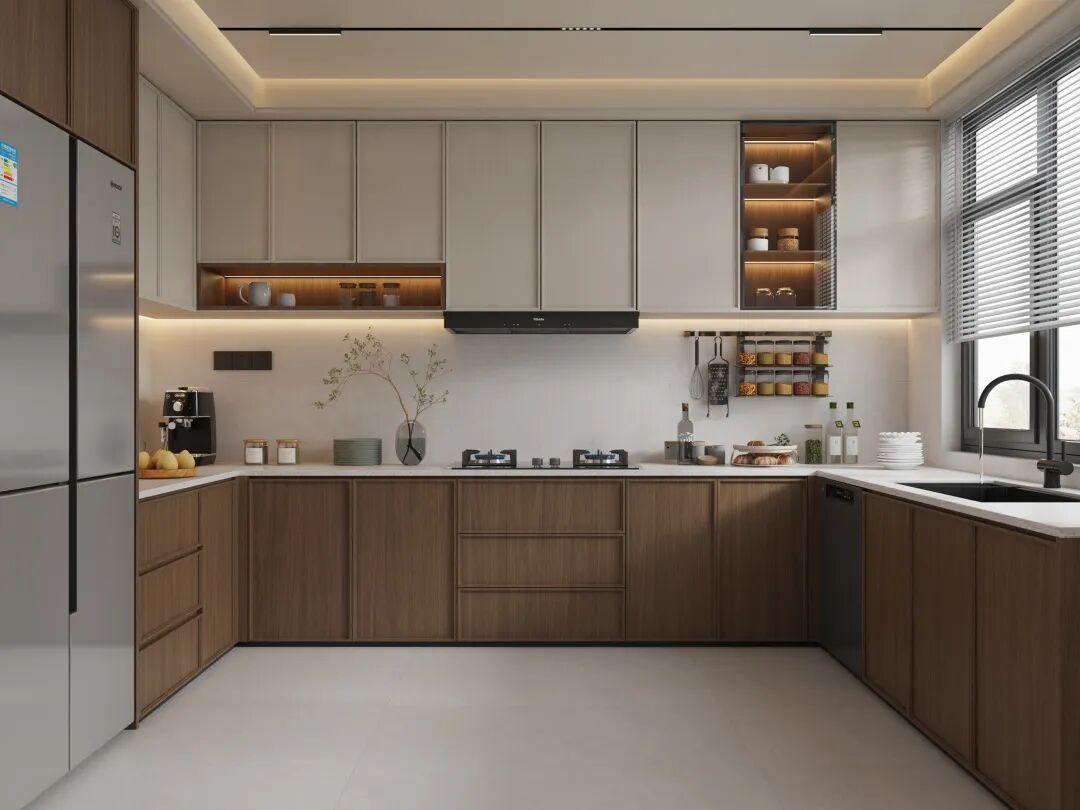 地面是「楓霧灰」同款字母磚的600*1200mm規格,與客廳風格自然銜接。防水耐油污、一擦即凈,防滑紋理保障安全,契合廚房需求。