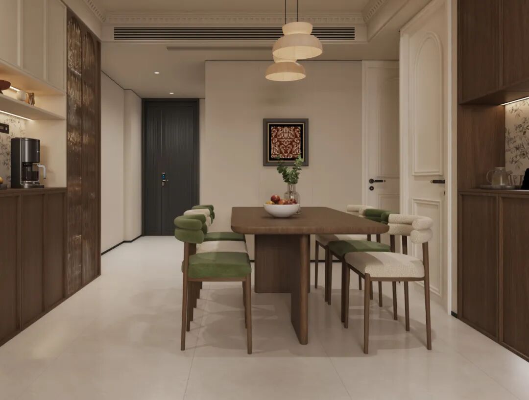 客餐廳為復古核心區,米白墻面搭配法式雕花吊頂與石膏線,層次分明。