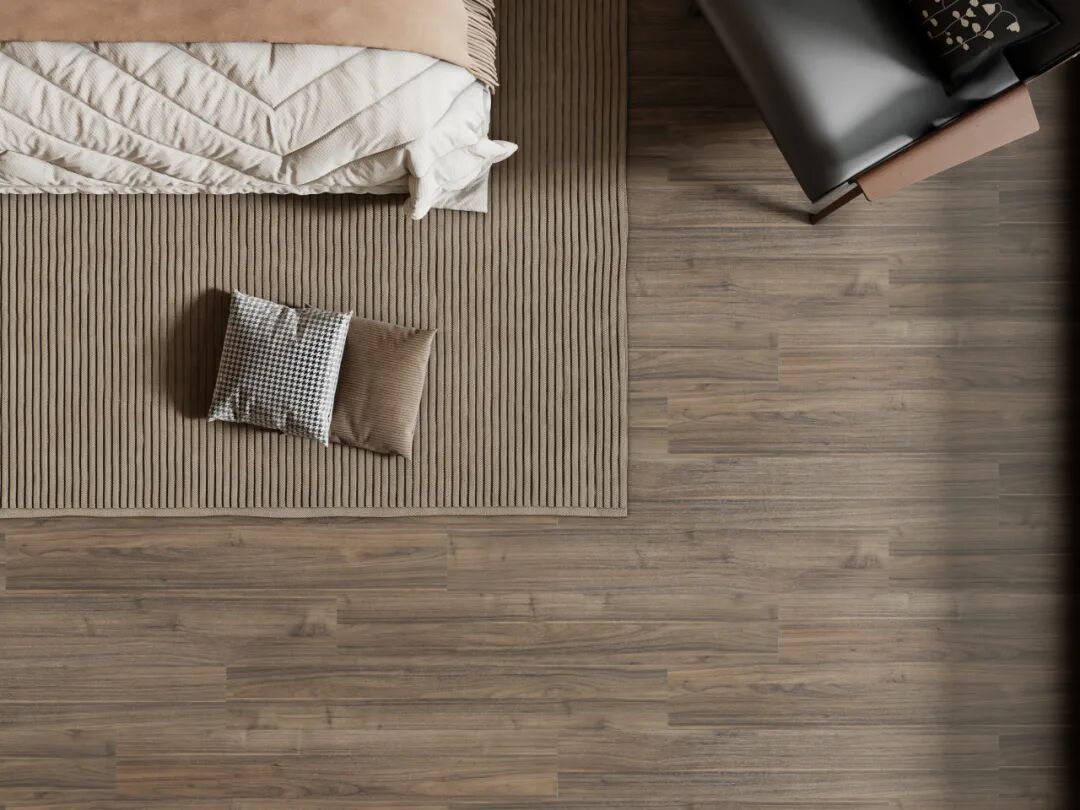 地面「北美胡桃木Y8HPL23VH石晶地板」木紋復古,暖棕調呼應墻面「綠色護墻板系列--奶咖WS」。石晶地板觸感細膩,耐磨靜音,營造安靜睡眠環境。