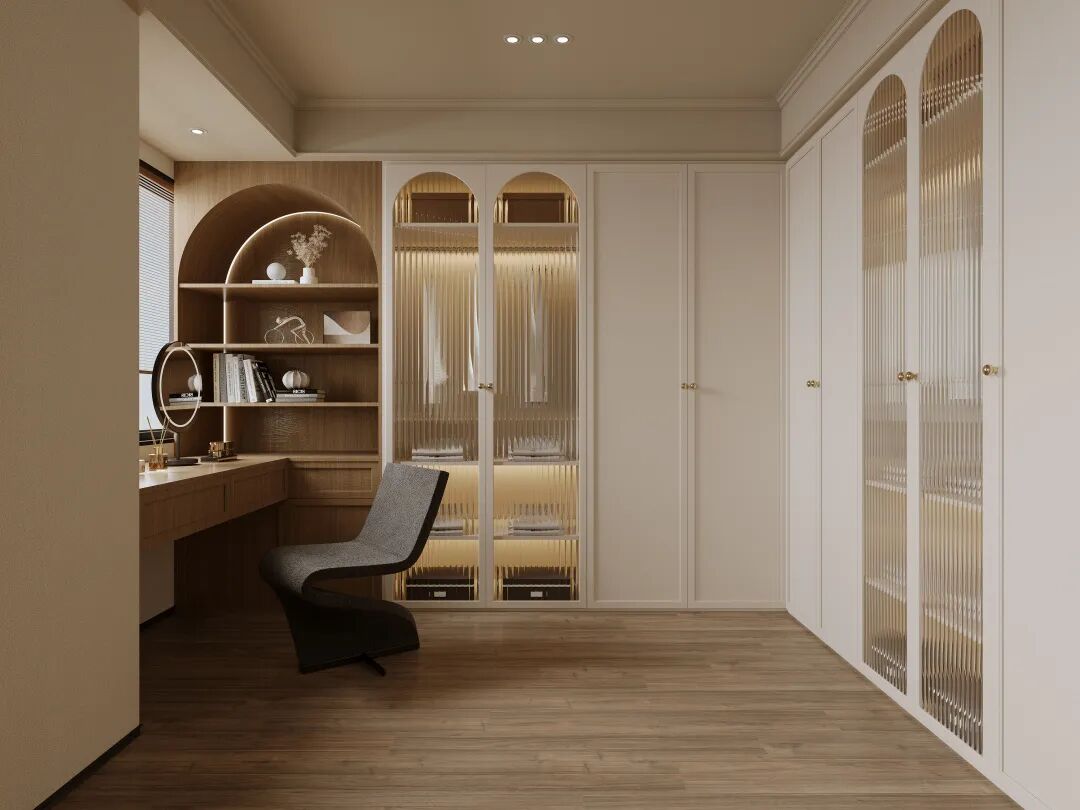 衣帽間延續復古風,淺色系定制衣柜最大化收納,玻璃柜門增通透。搭配復古拉手,風格統一,收納具儀式感。