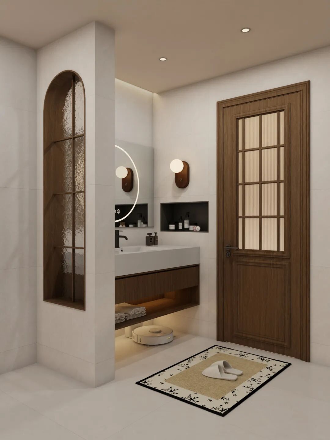 衛生間淺色調搭配白色潔具,干凈清爽。地面使用「楓霧灰 」同款600*1200mm規格,與客餐廳呼應,柔光避刺眼,防水防滑,實用舒適。